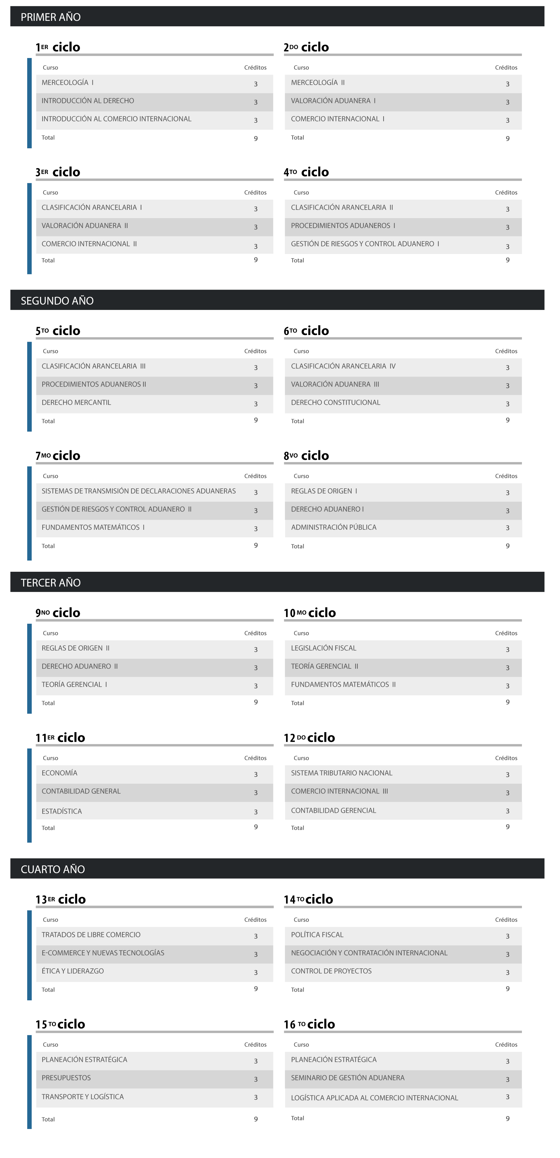 Curso Créditos ANÁLISIS Y EVALUACIÓN DE FALLAS 3 FORMULACIÓN EVALUACIÓN Y ADMINISTRACIÓN DE PROYECTOS 3 TÉCNICAS AVANZADAS DE NEGOCIOS 3 Total 9