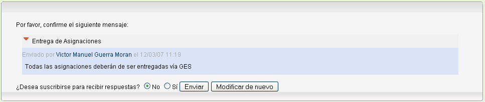 Si esta seguro que desea enviar el mensaje, haga clic sobre Enviar; de lo contrario haga clic sobre Modificar de Nuevo