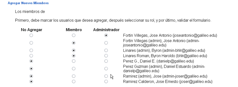 Seleccione que miembros del curso formaran parte de este subgrupo y designe el rol que tendran dentro del curso
