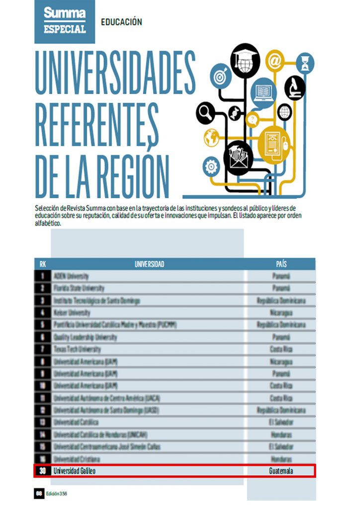 Universidad Galileo en el Ranking de Universidades Referentes de la Región por Revista Summa