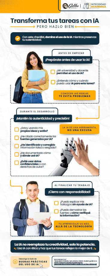 En esta sección encontrarás materiales diseñados para fortalecer una cultura de integridad académica frente al uso de la inteligencia artificial. Cada recurso ofrece recomendaciones prácticas, principios éticos y herramientas que orientan a docentes y estudiantes en la aplicación responsable de la IA en procesos de enseñanza, aprendizaje e investigación.